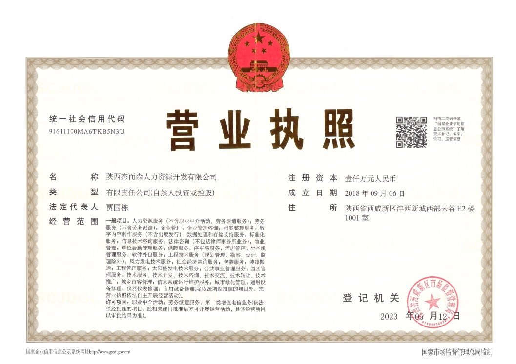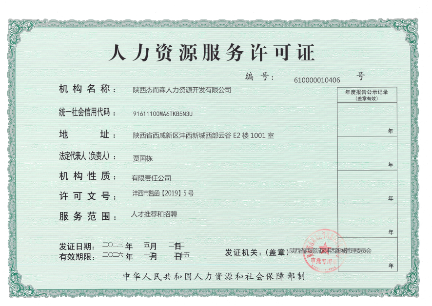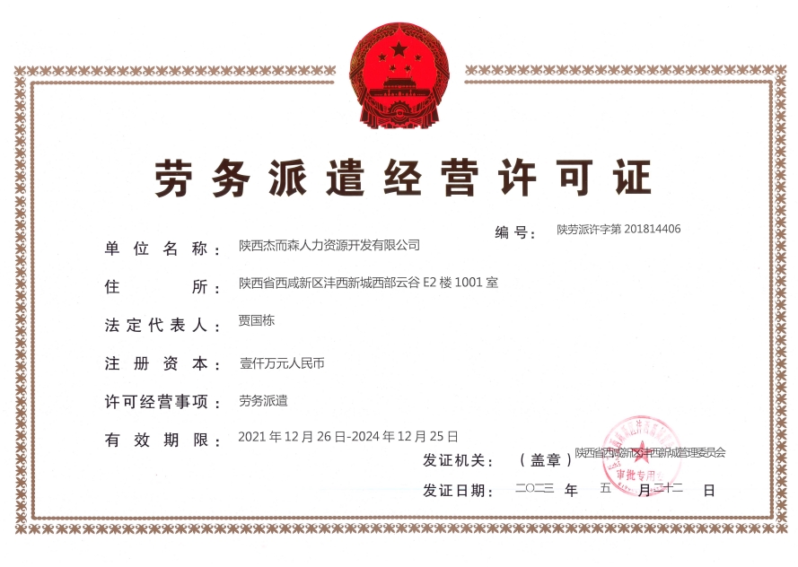 陜西杰而森人力資源開發(fā)有限公司成立于2018年,是一家以人力資源服務為主業(yè)的市場化專業(yè)機構。公司總部位于陜西省西咸新區(qū)秦創(chuàng)原人才大市場,下設6家分子公司。公司的主營業(yè)務包括:勞務派遣、勞務外包、業(yè)務流程外包、招聘、培訓、檔案整理和電子化等服務。